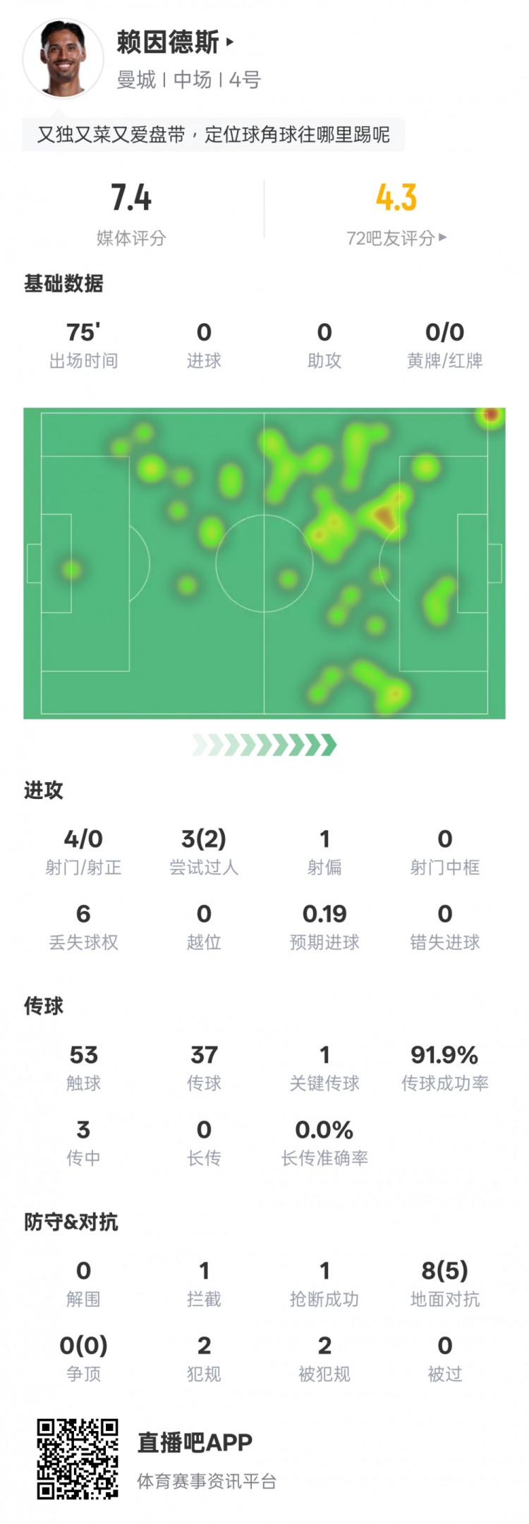 11月30日讯 英超第13轮,曼城主场迎战利兹联。赖因德斯首发出战,2次过东说念主生效,送出1次要害传球,传球生服从91.9%,评分7.4。