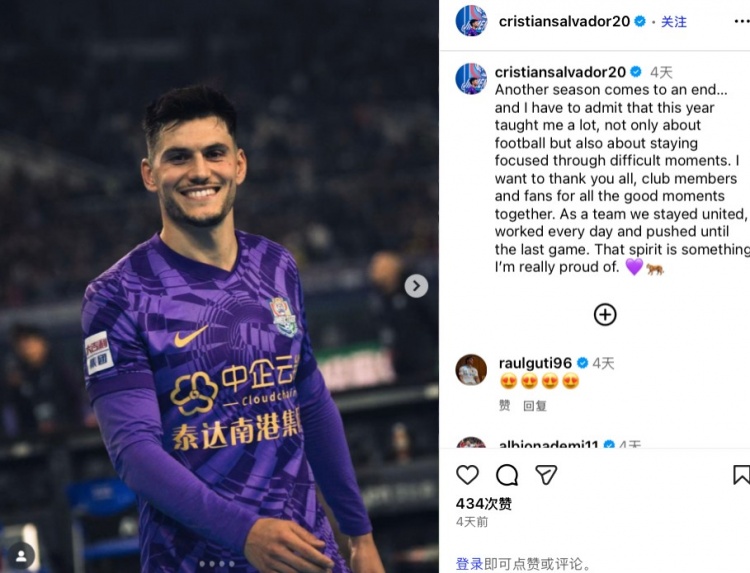 12月1日讯 2025中超联赛已落下帷幕,最终天津津门虎排在联赛第6位。津门虎外助萨尔瓦多在社媒发文,对赛季进行转头。