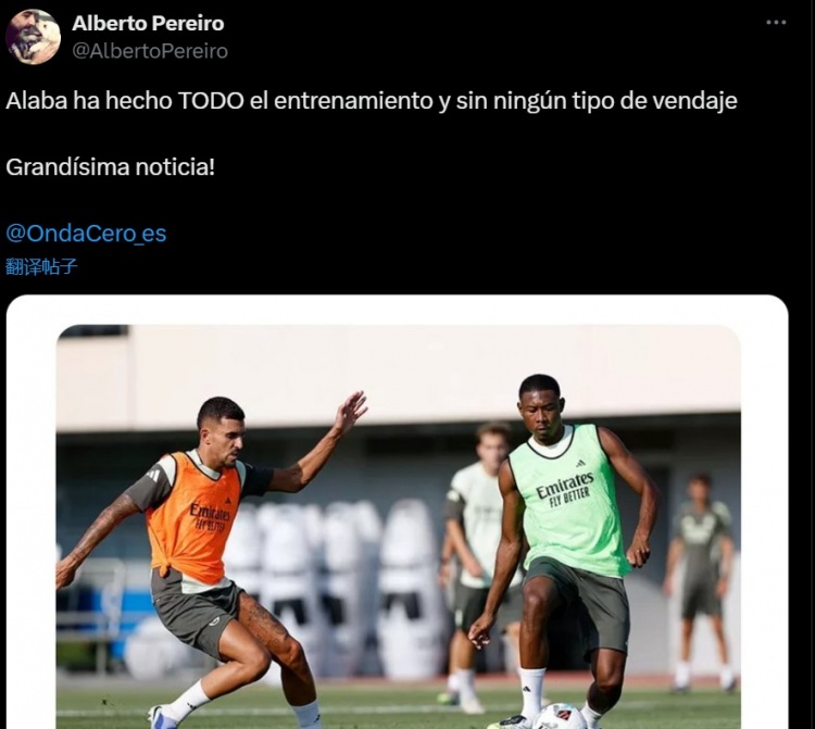 8月5日讯 据记者Alberto Pereiro报说念称,阿拉巴完好地插足了皇马全队的合练,何况莫得缠任何绷带。