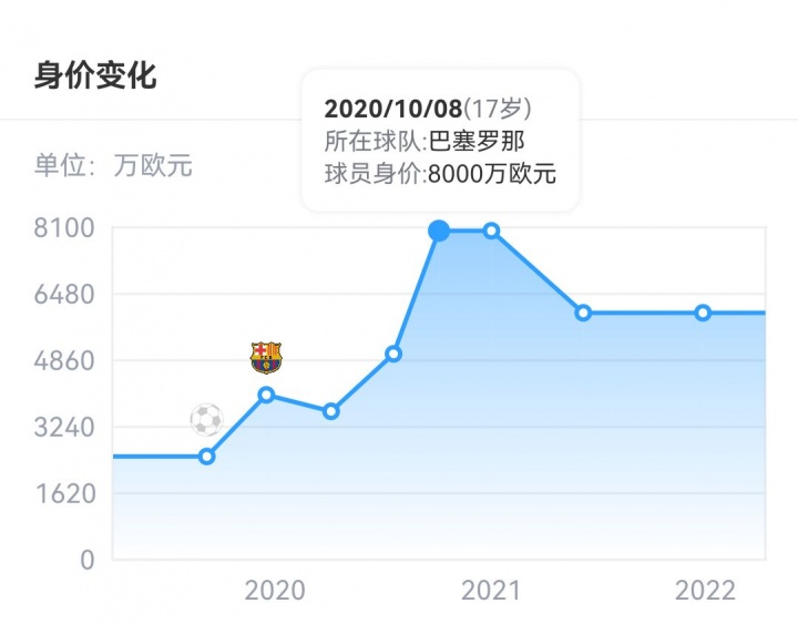 他在2020年达到了个东说念主巅峰身价8000万欧元,但随后受困于聚拢伤病,身价一齐走低,咫尺仅剩500万欧。
