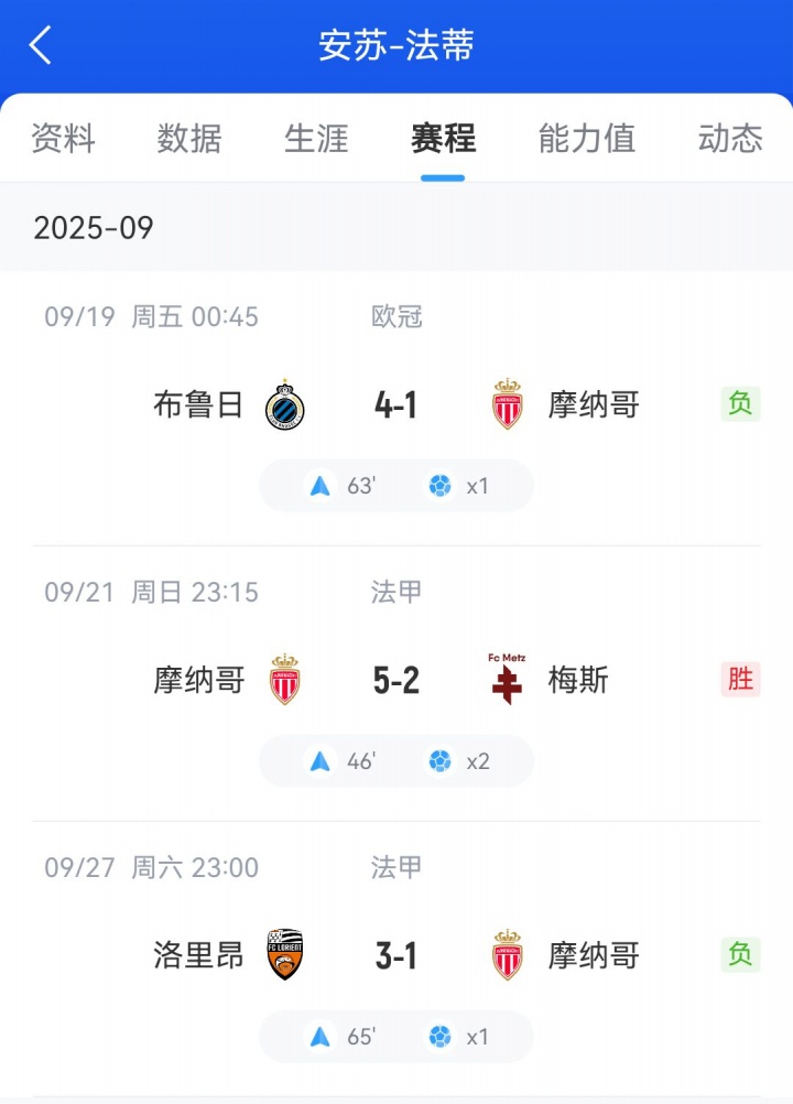咫尺,法蒂还是为摩纳哥出战3场比赛(均为替补登场),并在为数未几的上场时候中打进了4个进球。
