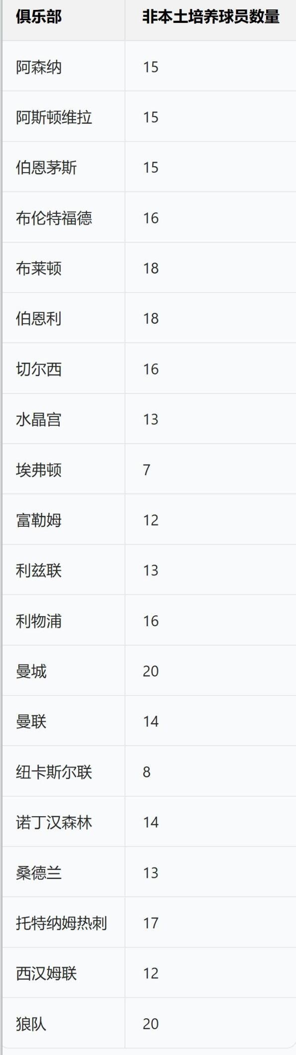 当今英超各俱乐部的非原土培养球员数目(部分俱乐部仍需在今夏进行调节):
