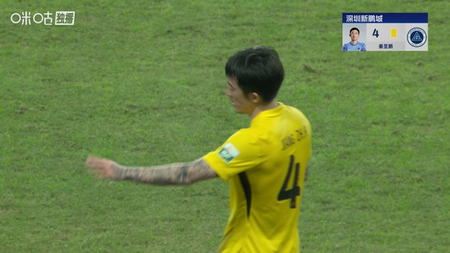 10月31日讯 中超第29轮,上海申花vs深圳新鹏城,比赛第39分钟,姜至鹏反抗时将高天意撞出场外,同期还撩腿踢到对方裆部,被主裁判出示黄牌。姜至鹏累计四黄停赛,无缘联赛收官战。