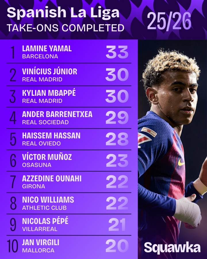 11月12日讯 巴萨亚马尔、皇马的姆巴佩和维尼修斯,他们在过东说念主冲突方面,皆有着超卓的天资。在2025-26赛季西甲联赛中,据Squawka数据统计,亚马尔在过东说念主次数排名榜单居首。