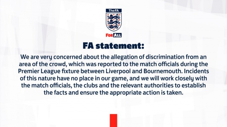 英足总声明:“咱们关于在利物浦与伯恩茅斯的英超比赛中,有不雅众区域传出厌烦举止的指控默示高度存眷。该指控已在比赛历程中上报给裁判组。”