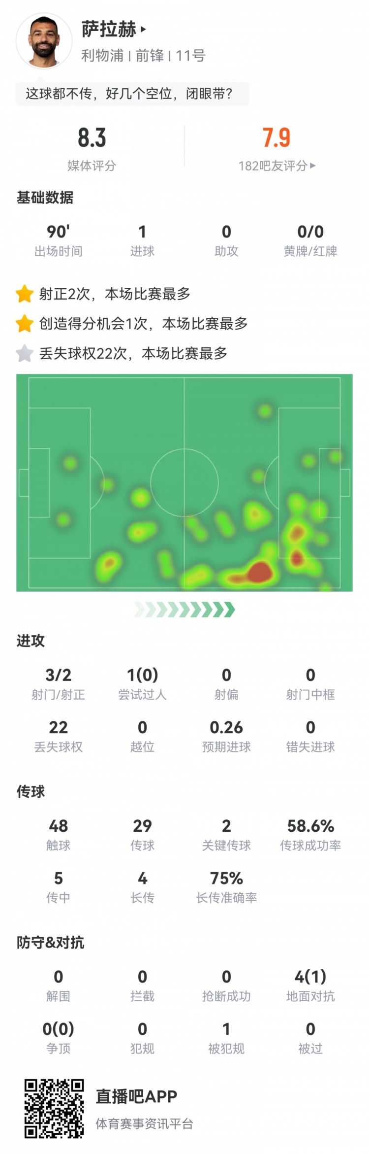8月16日讯 英超揭幕战,利物浦4-2伯恩茅斯,萨拉赫首发打满全场补时锁定胜局,球员全场要点数据如下↓