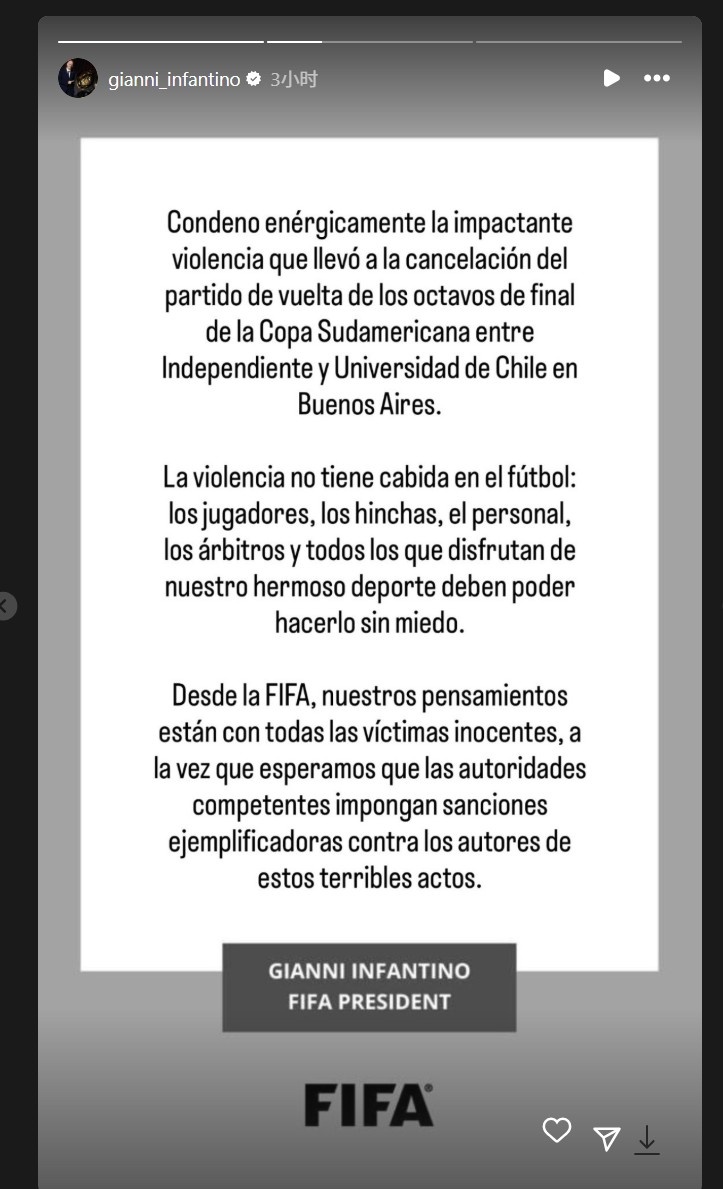 8月22日讯 海外足联主席因凡蒂诺激烈谴责了导致南好意思杯阿根廷落寞队与智利大学队比赛取消的暴力事件。