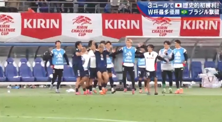 10月14日讯 麒麟杯海外友谊赛,日本主场让二追三逆转五星巴西,赛后日本替补席真的全员冲入场内心绪庆祝。这是他们历史初度打败巴西这一劲敌。