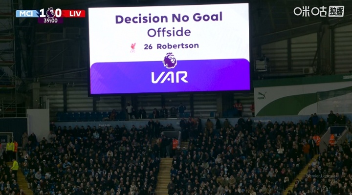 11月12日讯 曼城3-0利物浦比赛的第38分钟,范戴克头球破门,但VAR判定罗伯逊越位位置插手,进球被判无效。