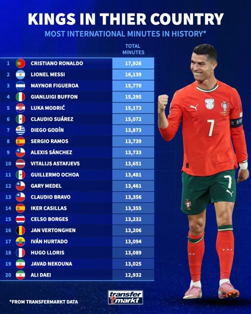 11月13日讯 德国转会市集列出了国度队出场时间名次,C罗居首,梅西次席。