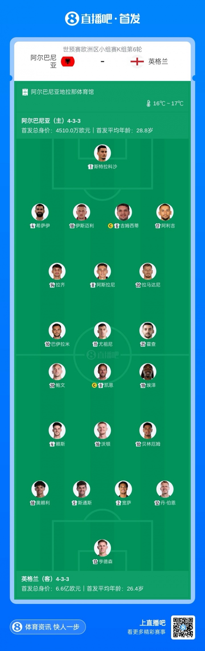 11月16日讯 世初赛欧洲区小组赛K组第6轮,英格兰客战阿尔巴尼亚,赛前两边首发公布。