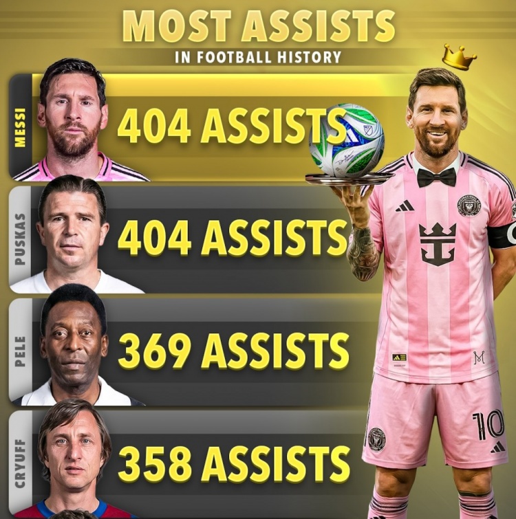 11月24日讯 好意思职联比赛,梅西1射3助指令迈阿密4-0完胜辛辛那提,晋级东部决赛。至此,梅西已管事生存助攻数已达404次。据score90数据统计,梅西404次助攻已追平普斯卡什,两东说念主比肩天下足坛助攻榜榜首。