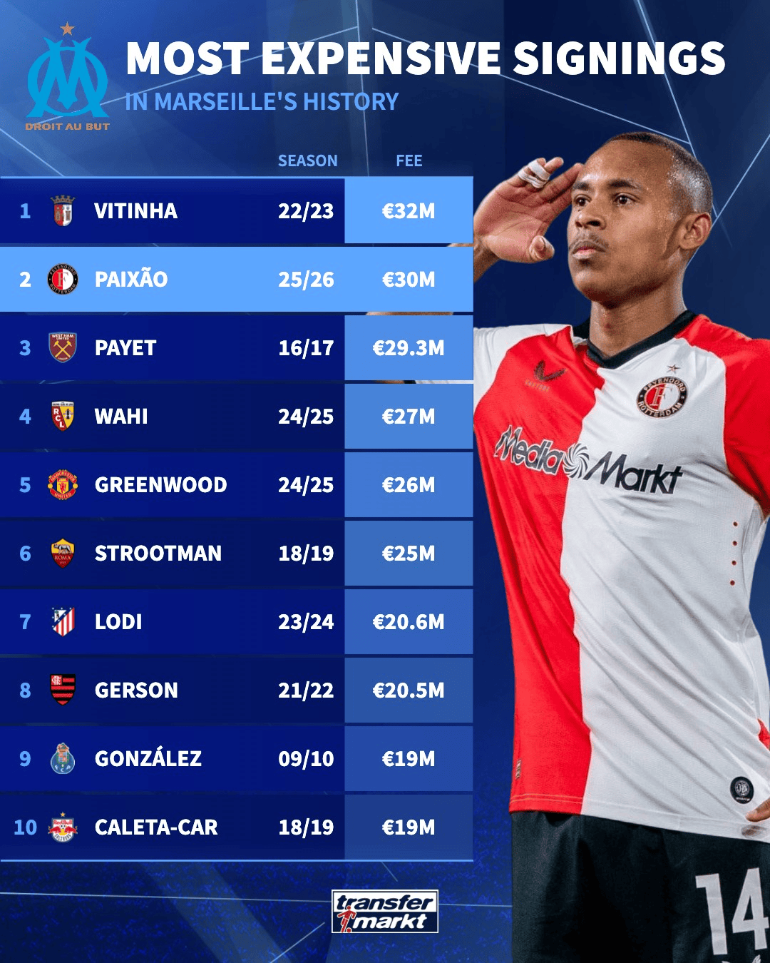 虎扑08月02日讯马赛官宣签下派尚,他的固定转会费为3000万欧元。德转也发布了榜单,实质为马赛队史的引援价钱榜。