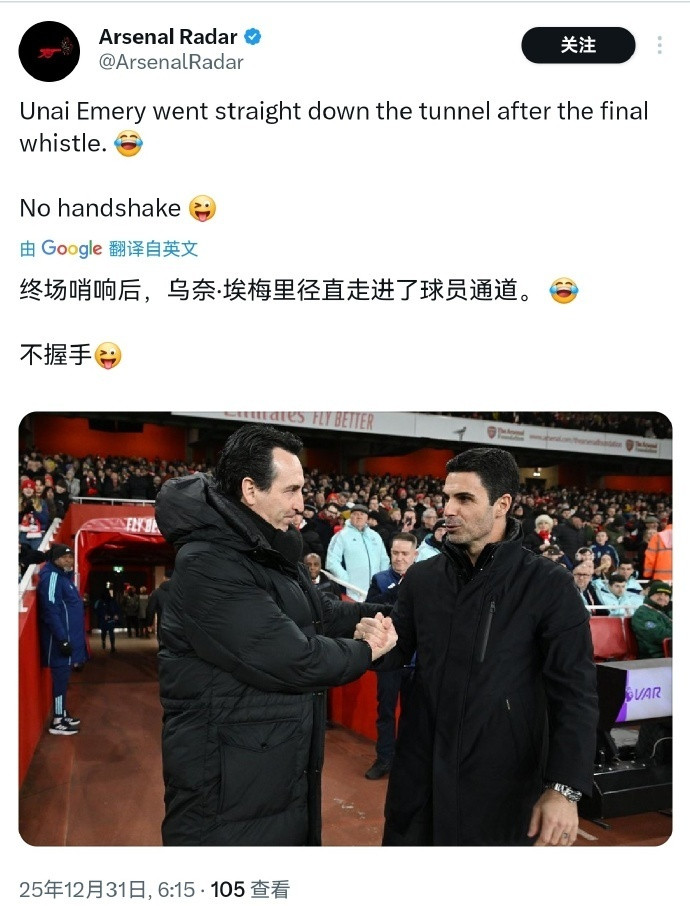 当阿尔特塔和助教击掌相庆后,准备找到埃梅里捏手时,他的西班牙前辈还是销亡无踪。
