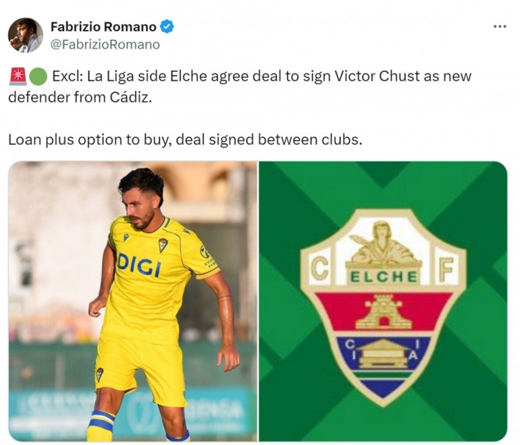罗马诺露馅,埃尔切引进加的斯中卫丘斯特的交游兑现左券,转会神气为租出+遴荐买断,两家俱乐部仍是签署了相干文献。