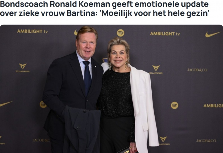 周四,罗纳德-科曼荣获荷甲终生配置奖,但他将奖项献给了身患重病的太太巴蒂娜。