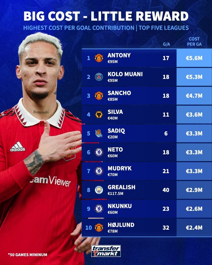 08月08日讯 本日德转清点了参与进球消耗转会费最多的球员,其中安东尼以560万欧每球,位列榜首,前十曼联、切尔西各占3席。