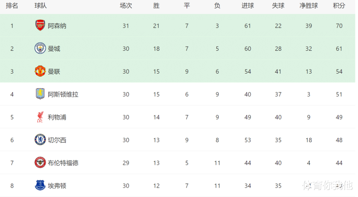 随着利物浦爆冷,争四的形势也发生了巨大的变化。在此之前,切尔西在主场作战 输给了纽卡斯尔,再加上维拉在客场应战 1-3大败 给曼联,本轮赛事 ,利物浦、切尔西和维拉3支争四强队全部不胜,曼联也成为唯一的赢家。截至目前,在积分榜上,曼联领跑 第五的利物浦5分,已经甩开身后的对手至少一个身位了。