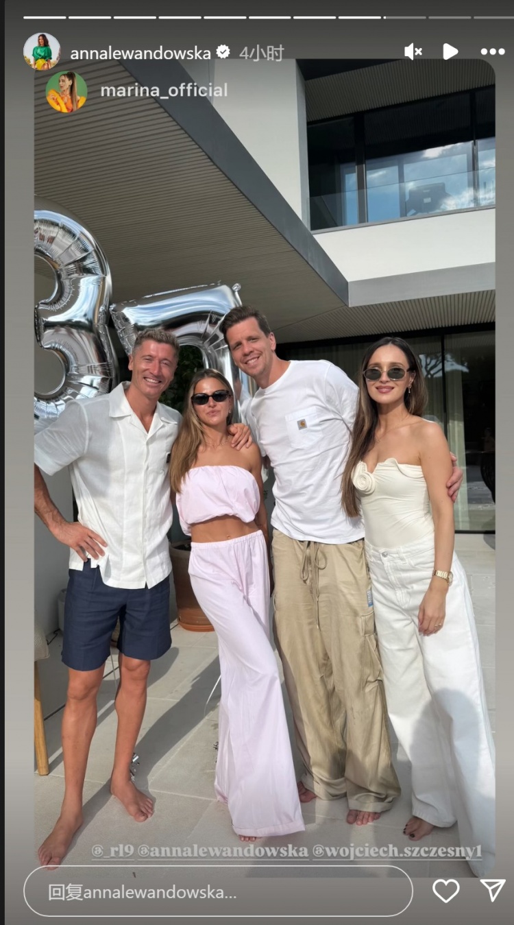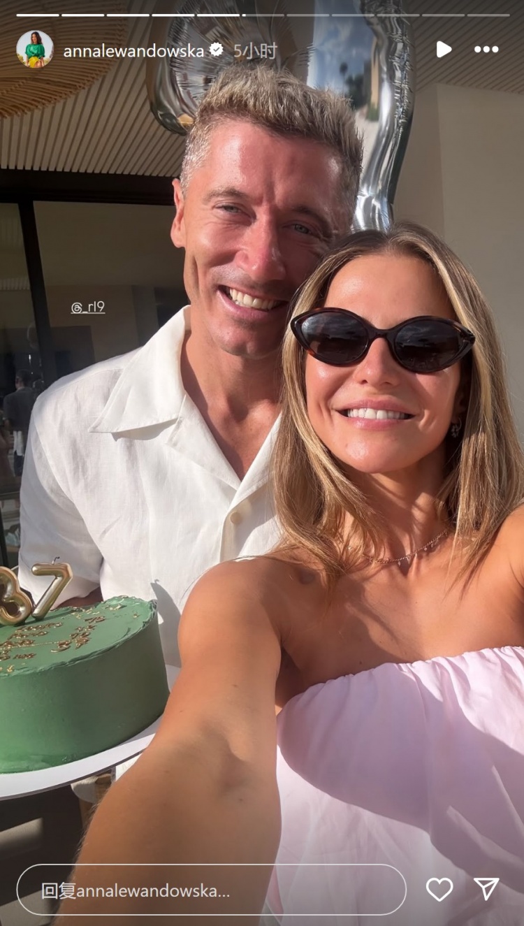 巴萨先锋莱万迎来了37岁寿辰,细君安娜在外交媒体上晒成就日约会像片和视频,祝莱万寿辰欢娱,什琴斯尼也插足了约会。