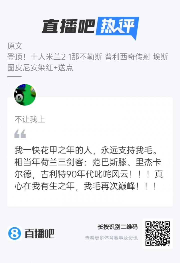 意甲第5轮,十东谈主AC米兰2-1那不勒斯,登顶意甲!关于红黑军团的出色施展,不少老球迷皆在探究区发出惊羡!其中一位名为【梦回圣西罗@】的吧友的探究,让东谈主动容。