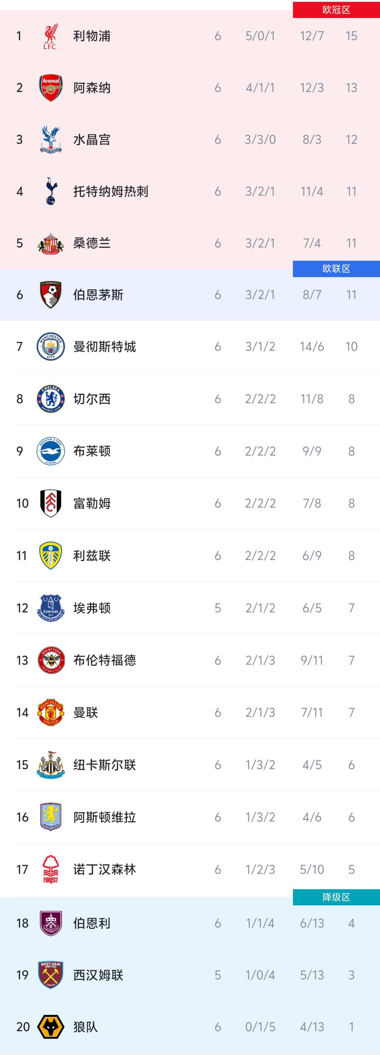 桑德兰、伯恩茅斯的开局相通可以,他们压过曼城和切尔西排在第五和第六名。