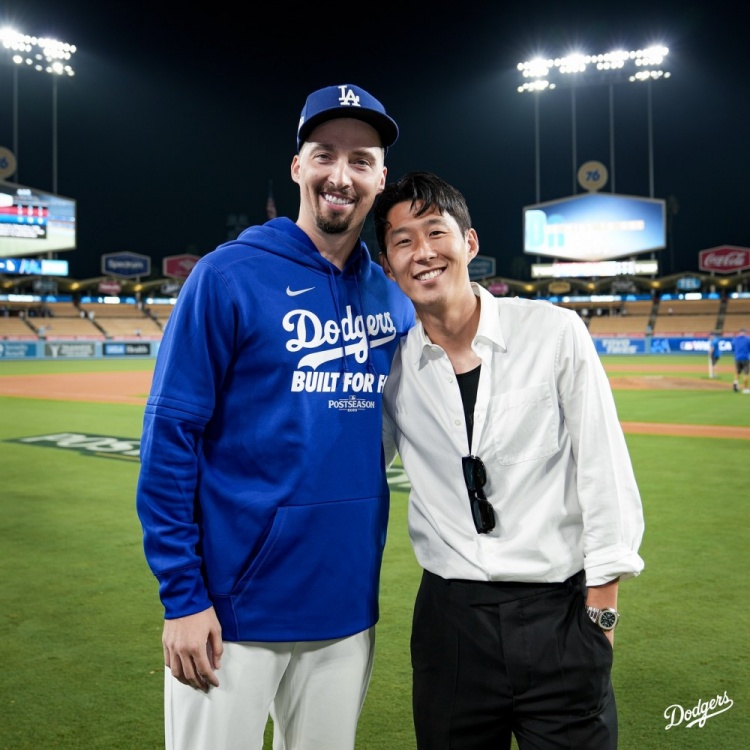 孙兴慜现场不雅看了洛杉矶谈奇对阵辛辛那提红东谈主的MLB外卡赛首战,谈奇以10-5取胜,孙兴慜与谈奇投手斯内尔合影。