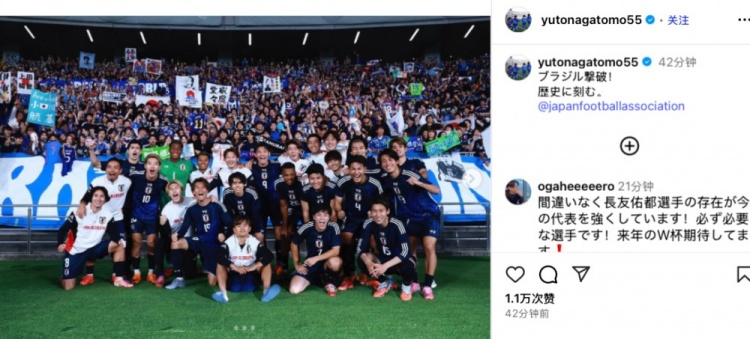 赛后38岁日本队宿将长友佑皆更新社媒,晒出了赛后全队合照,并配文庆祝收效:“打败巴西队!当天将载入汗青。”