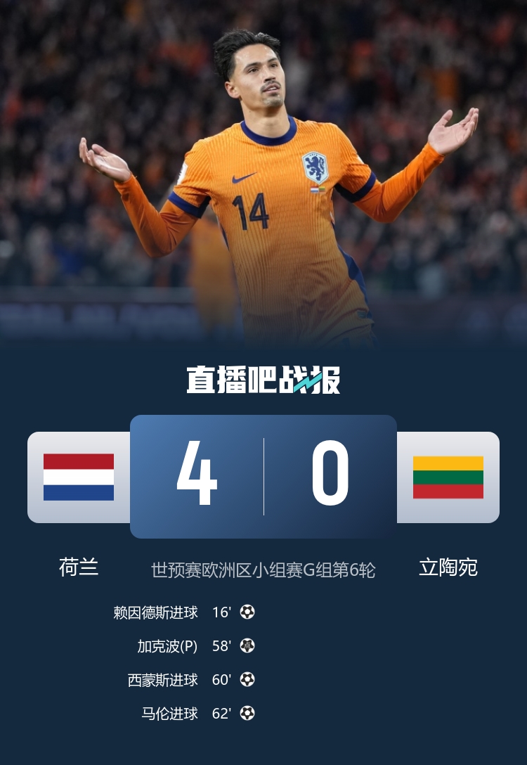 世初赛欧洲区小组赛G组第6轮,荷兰4-0立陶宛,赖因德斯、加克波传射。