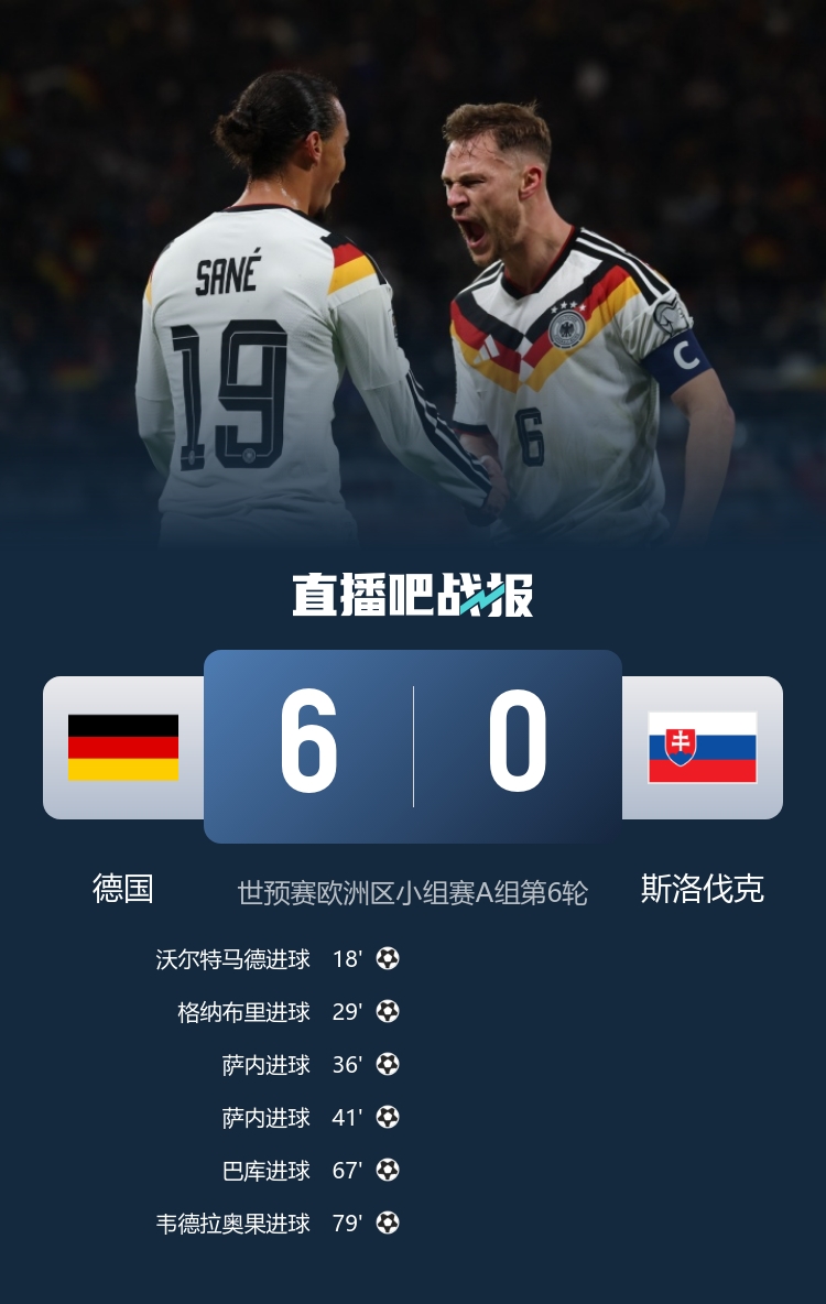 进寰球杯!德国6-0横扫斯洛伐克 维尔茨两助萨内双响格纳布里传射