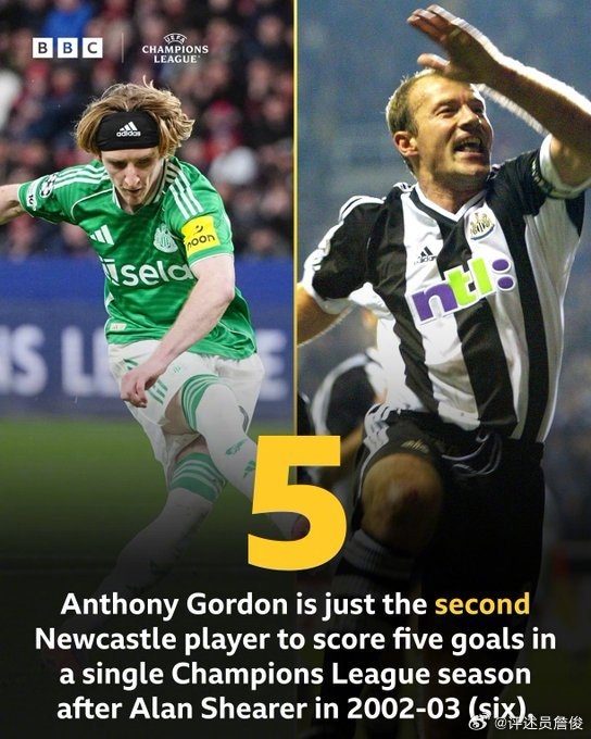 詹俊:“戈登这个赛季的点球射中率100%,本季7个俱乐部进球中5个是点球,他也成为继希勒后纽卡首位单季在欧冠进球至少5球的球员。‘喜鹊’客场战平勒沃库森。