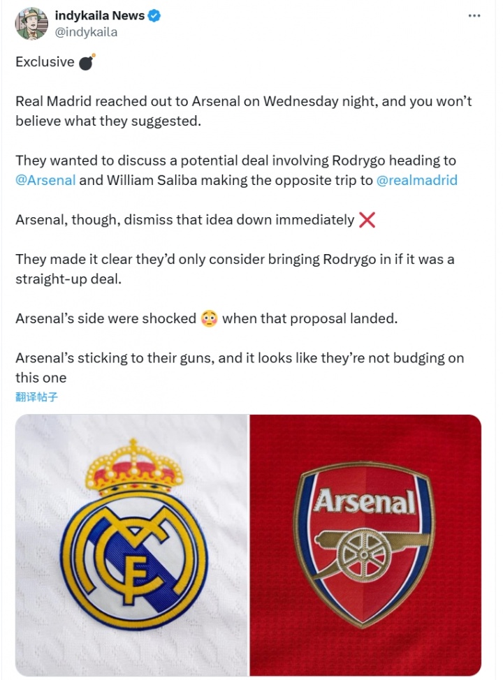 据驰名转会博主绿帽哥“Indykalia News”独家音讯,皇马周三晚与阿森纳得回了关系,建议用罗德里戈交换萨利巴,这一建议被阿森纳立即闭幕。
