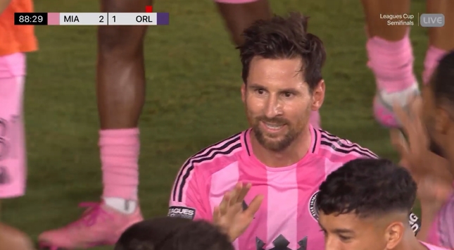 定约杯半决赛,迈阿密外洋vs奥兰多城。梅西梅开二度后和队友庆祝,头发立起来了!