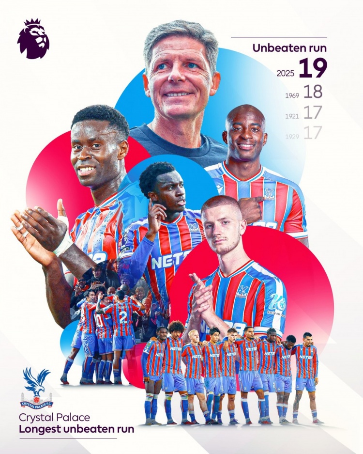 水晶宫各赛事19场不败,创造队史最长不败记录。