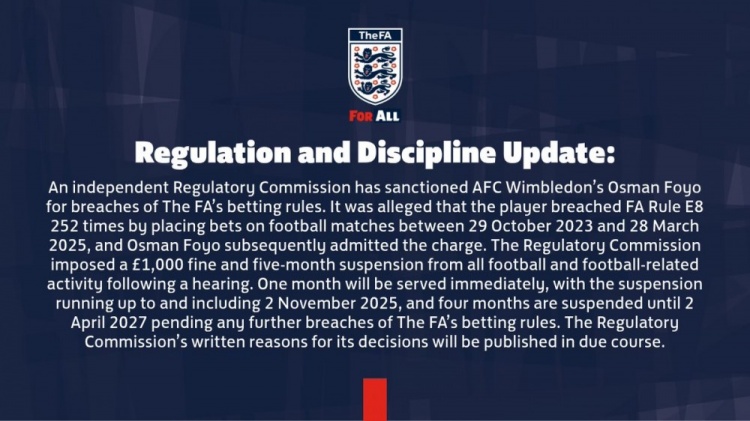 孤独监管委员会已对AFC温布尔登球员奥斯曼-福约违背博彩条例的步履作出解决。据指控,该球员在2023年10月29日至2025年3月28日历间对足球比赛进行投注,违背英足总E8条例252次。