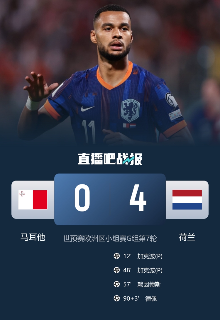 上半场赫拉芬贝赫造点,加克波点射闪击笔直,下半场加克波点射完成双响,赖因德斯推射扩大比分,德佩替补立功,最终荷兰4-0马耳他三分领跑。