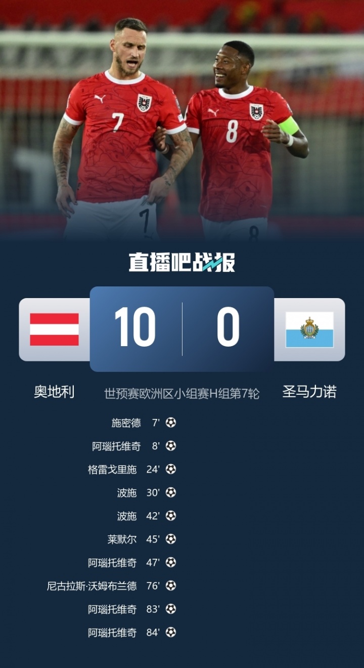 奥地利10-0狂胜圣马力诺,阿瑙托维奇大四喜。奥地利5连胜领跑H组;圣马力诺6连败、只进1球狂丢28球,名次倒数第一。