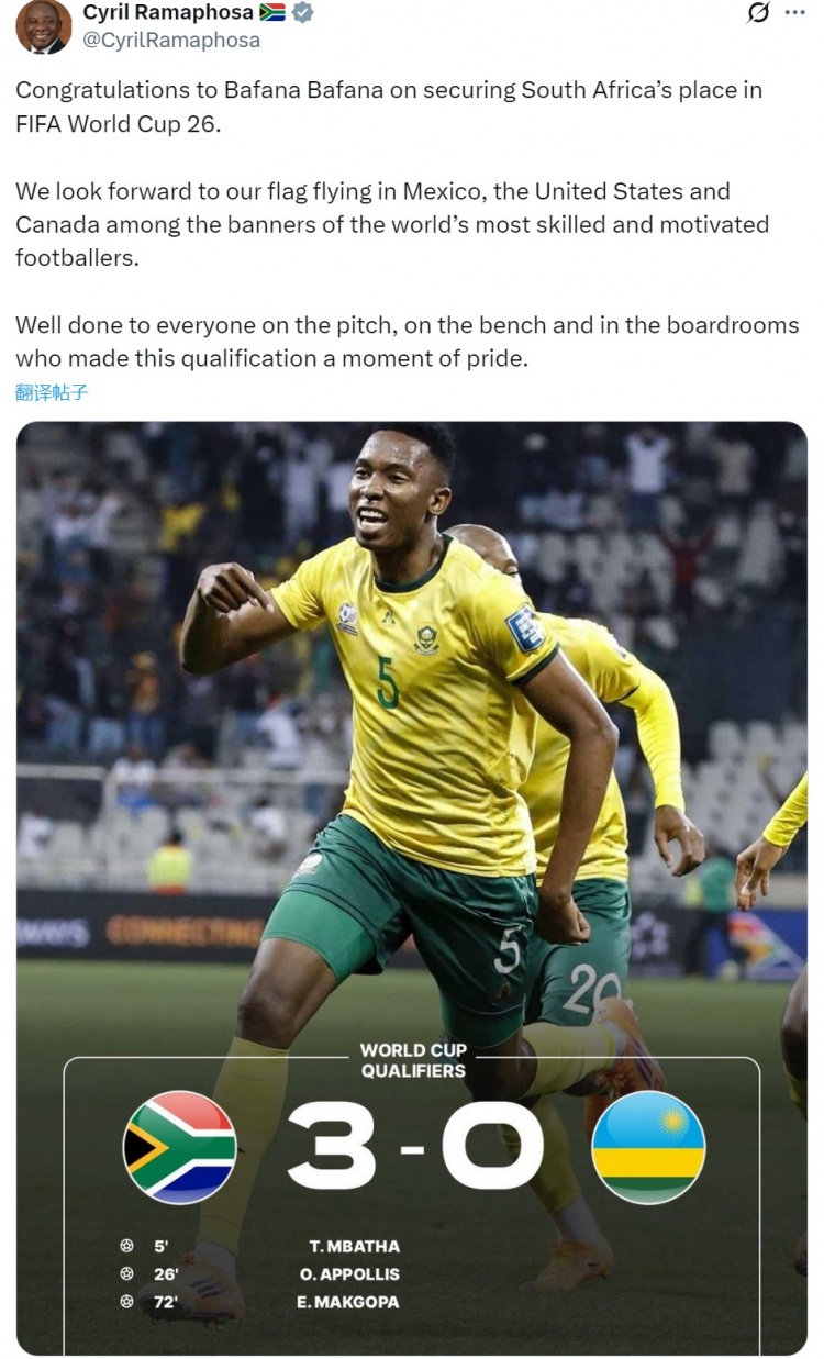 南非总统拉马福萨连发两条推文,对南非队示意道贺,首条推文写谈:“咱们进犯2026年寰宇杯!祝贺南非国度队举座成员,通盘南非将一如既往地因循你们,一皆同业。”