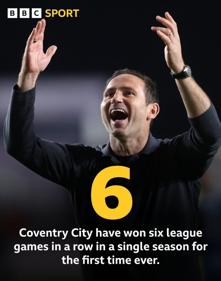 据统计,这亦然考文垂队史初次在单一赛季获得联赛6连胜,兰帕德携带球队创造历史。
