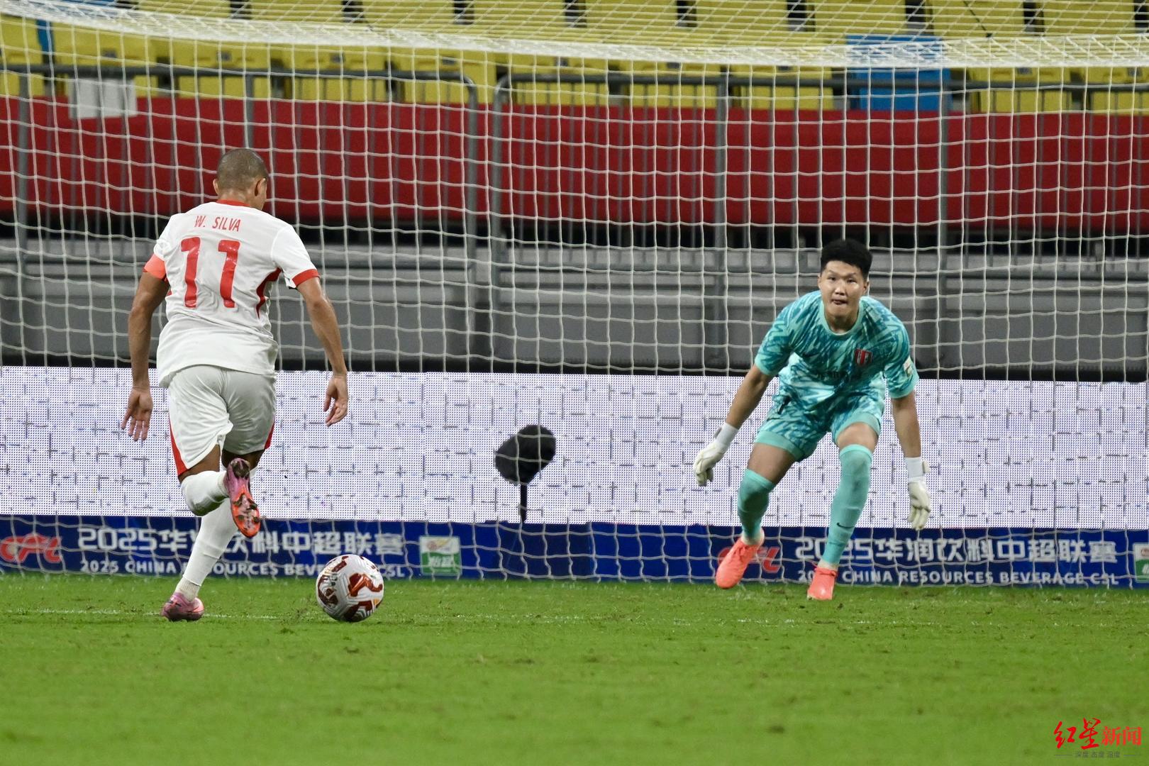 第33分钟,青岛海牛得回破门良机,久疏战阵的蓉城年青门将蹇韬挺身而出,他先是挡住了席尔瓦的单刀球,随后又将青岛球员近在目下的头球扑出,力保大门不失。