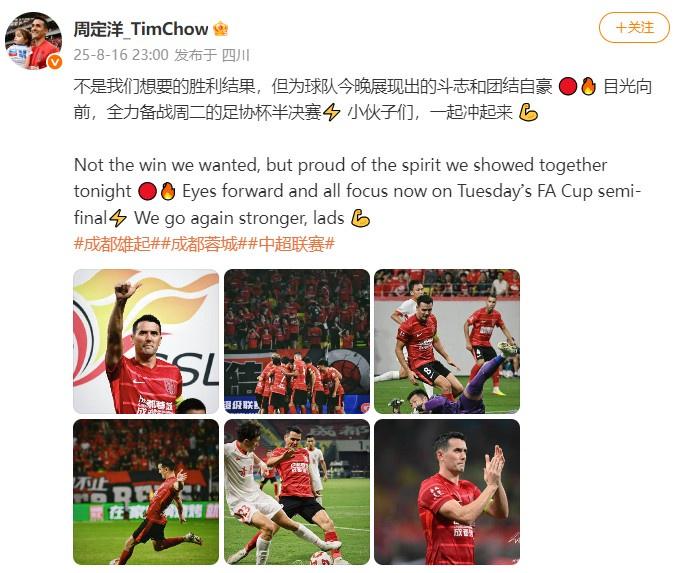 赛后,蓉城球员更新个东谈主社媒,他晒出本场的赛场像片,并用中英双语写谈:“不是咱们思要的顺利成果,但为球队今晚展现出的斗志和合营自重 眼神上前,全力备战周二的足协杯半决赛⚡️ 小伙子们,一皆冲起来”